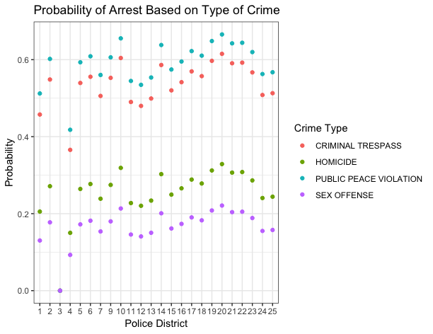 My focus for this project is predicting the whether or not someone will get arrested after getting caught for committing a crime. For this model, we include the police districts to see if certain districts have a higher probability of people getting arrested based on certain crimes. We can see that those committing public peace violation in district 20 have the highest probability of being arrested based on our logistic model. Sex offense in district 3 has the lowest probability of being arrested. Arrest because the person committed a sex offense has the lowest probability across all of the police districts.