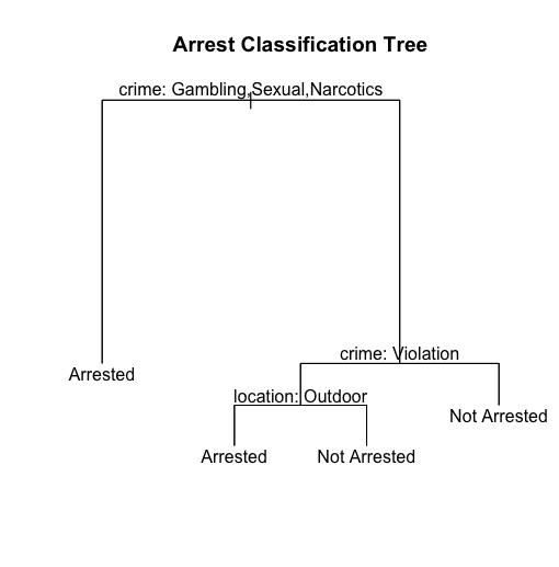 If my understanding of classification trees is correct, then the most influential levels of type of crime are up on top, which in this case are gambling, narcotics, and sexual crimes. From there, influence on whether the person gets arrested trickles down as we go further down the tree.