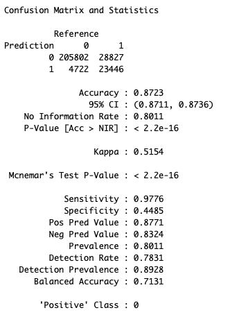 Looking at the confusion matrix that was generated, we have that: 205,802 people were correctly predicted to not have been arrested, 23,446 were correctly predicted to have been arrested, 28,827 were incorrectly predicted to not have been arrested, and 4,722 people were incorrectly predicted to have been arrested. The matrix tells us that the model was correct 87.23% of the time. The balanced accuracy is 71.31%, which I am more inclined to look at because the balanced accuracy takes into consideration the class imbalance that is definitely present.